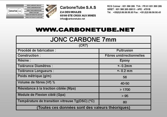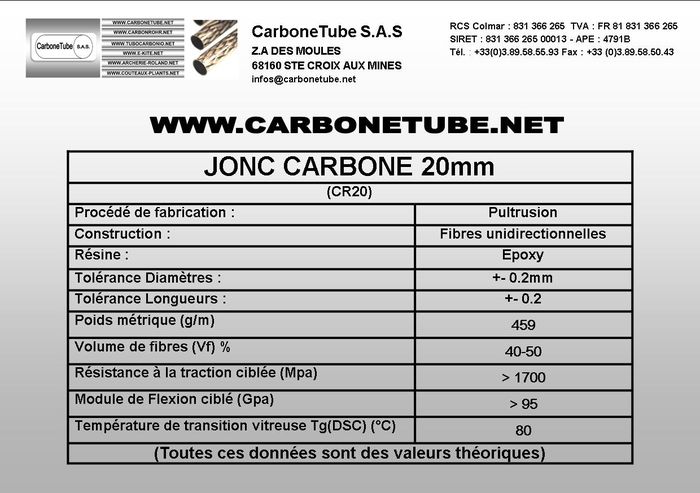 Construction: Pultrusion, carbone haute résistance, fibres unidirectionnelles, résine epoxy.